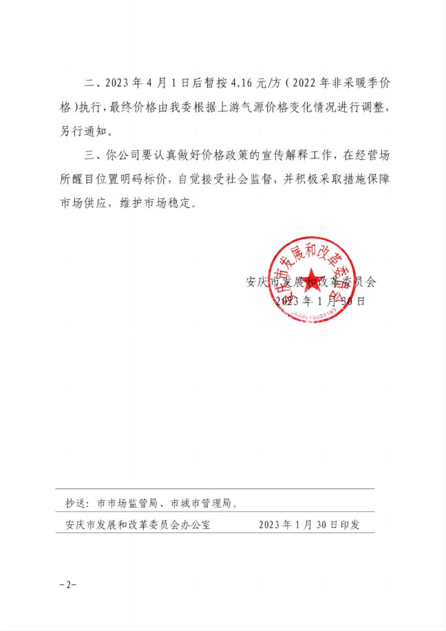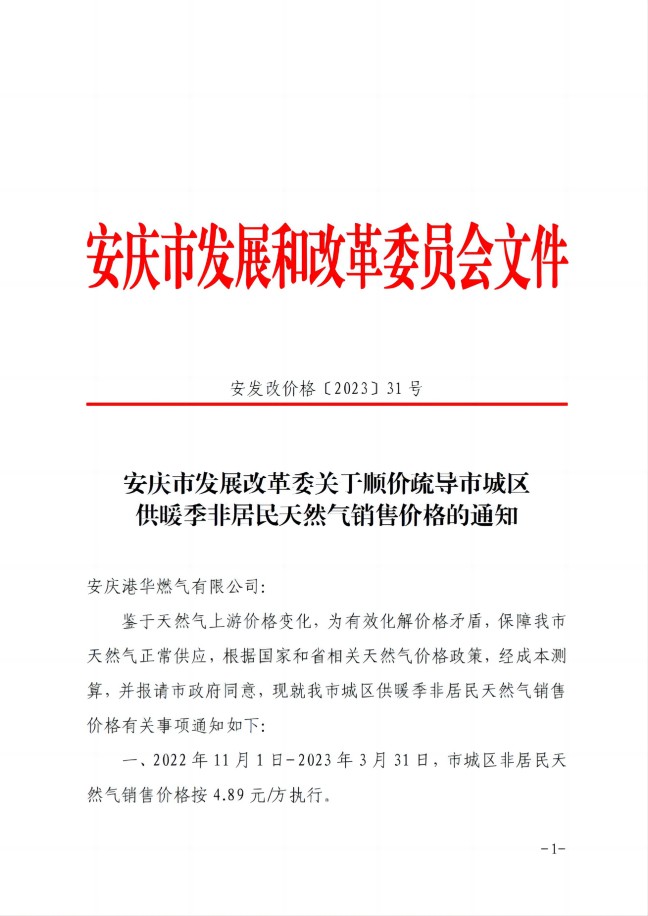安慶市發(fā)展改革委關(guān)于順價疏導(dǎo)市城區(qū)供暖季非居民天然氣銷售(2023)價格的通知-安發(fā)改價格【2023】31號