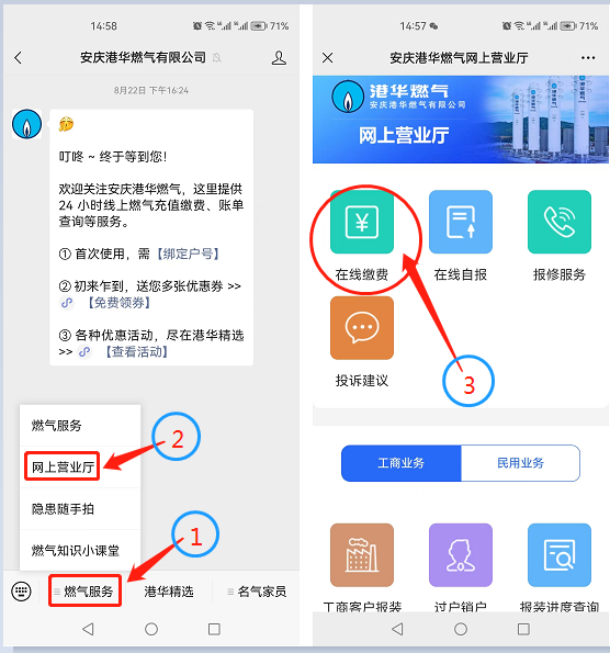 微信公眾號(hào):關(guān)注我公司微信公眾號(hào)“安慶港華燃?xì)庥邢薰尽?,點(diǎn)擊“燃?xì)夥?wù)”-“網(wǎng)上營(yíng)業(yè)廳”,在網(wǎng)上營(yíng)業(yè)廳中選擇“在線繳費(fèi)”,即可繳納燃?xì)赓M(fèi)或者預(yù)存氣費(fèi)。