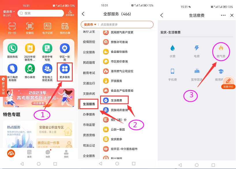皖事通:安裝并打開皖事通APP,進(jìn)入“更多服務(wù)”-選擇“生活服務(wù)”-“生活繳費(fèi)”,點(diǎn)擊“燃?xì)赓M(fèi)繳納”即可繳納燃?xì)赓M(fèi)或者預(yù)存氣費(fèi)。