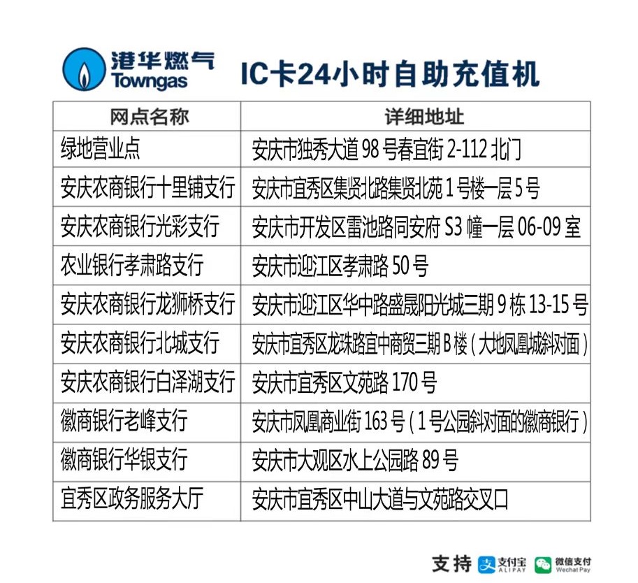 目前我公司支持交通銀行、徽商銀行、郵政儲(chǔ)蓄銀行、工商銀行、農(nóng)業(yè)銀行和浦發(fā)銀行的網(wǎng)上銀行和手機(jī)銀行,以及移動(dòng)“中國(guó)移動(dòng)”、電信“翼支付”、我公司微信公眾號(hào)和在“微信”-“生活繳費(fèi)”、“支付寶”-“生活繳費(fèi)”中查詢?nèi)細(xì)赓M(fèi)并繳納欠費(fèi)或預(yù)存氣費(fèi)。