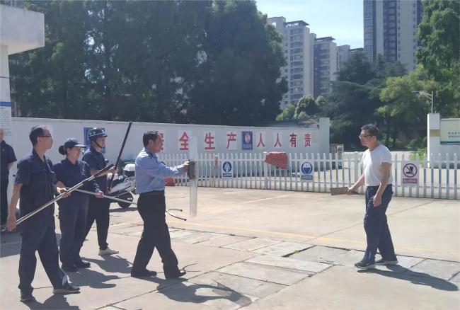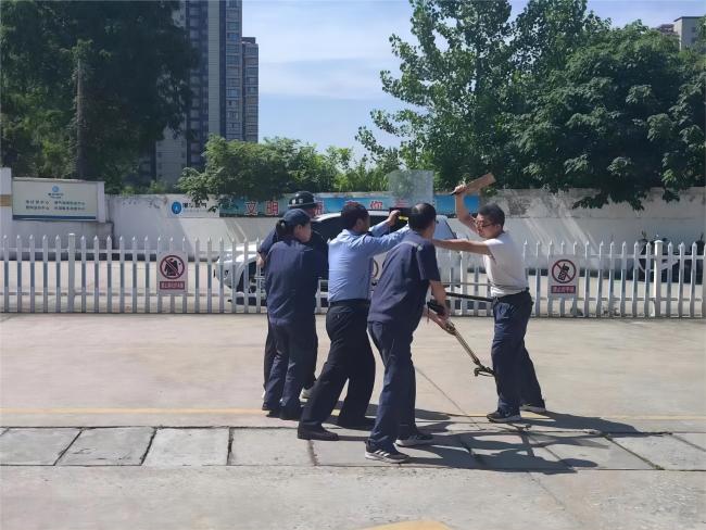 演練模擬了一起發(fā)生在加氣站的歹徒持刀威脅加氣工作人員的惡性事件。站內(nèi)員工發(fā)現(xiàn)嫌疑人員后,手持盾牌及警棍立即上前阻攔,其他人員及時(shí)配合并撥打轄區(qū)民警電話報(bào)警,站內(nèi)員工利用警棍、鋼叉等防衛(wèi)武器配合到達(dá)現(xiàn)場(chǎng)的民警將歹徒制服。