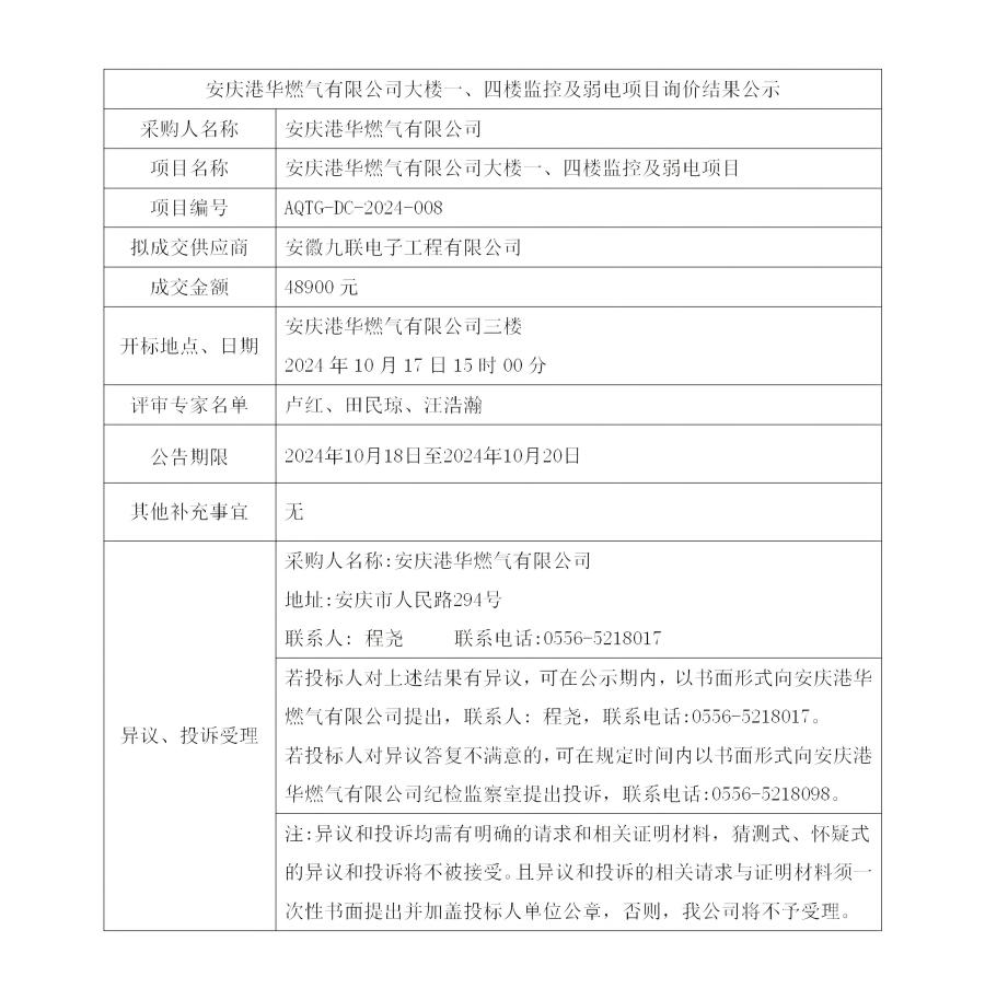 安慶港華燃氣有限公司大樓一、四樓監(jiān)控及弱電項目詢價結果公示