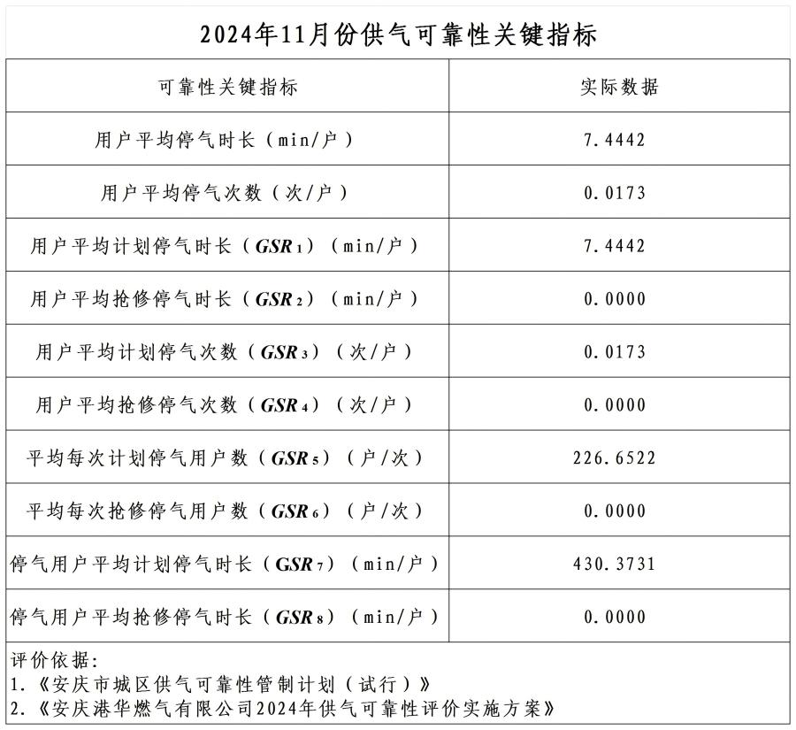2024年11月份供氣可靠性關(guān)鍵指標(biāo)