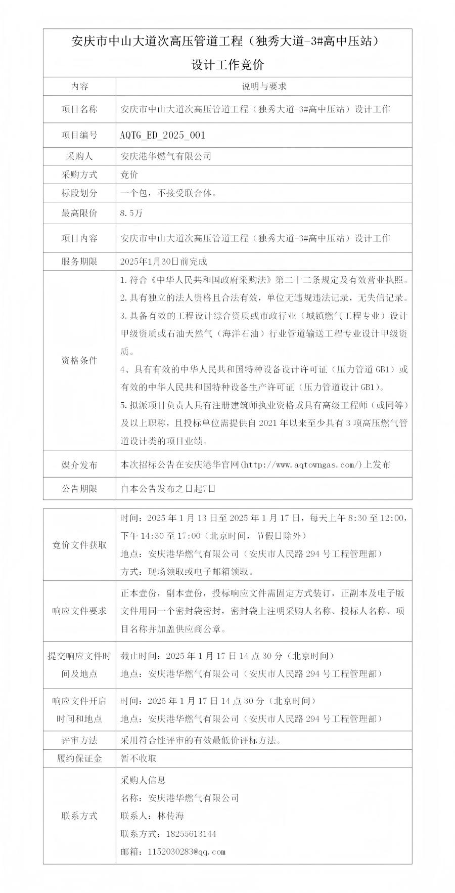 安慶市中山大道次高壓管道工程(獨(dú)秀大道-3#高中壓站)設(shè)計(jì)工作競(jìng)價(jià)