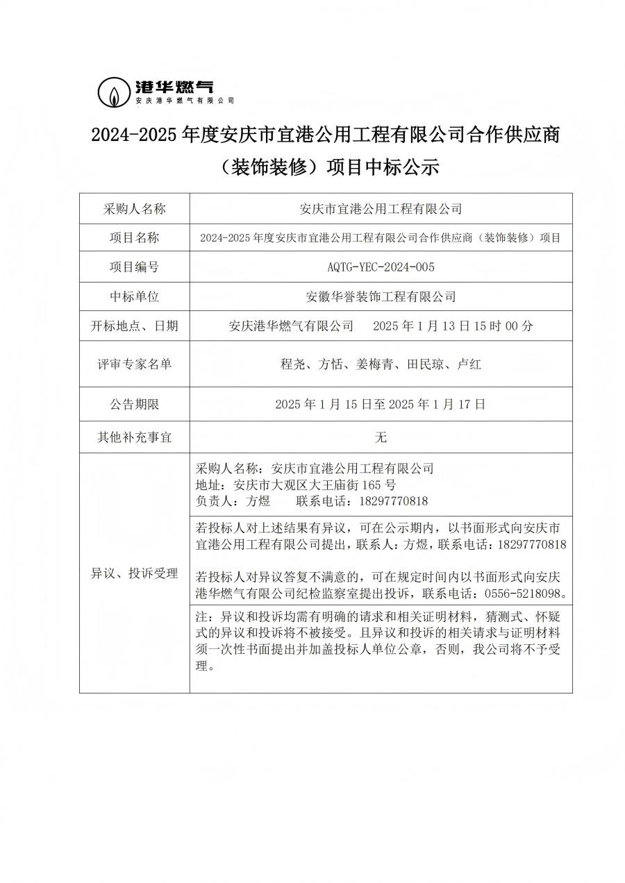 2024-2025 年度安慶市宜港公用工程有限公司合作供應(yīng)商 (裝飾裝修)項(xiàng)目中標(biāo)公示