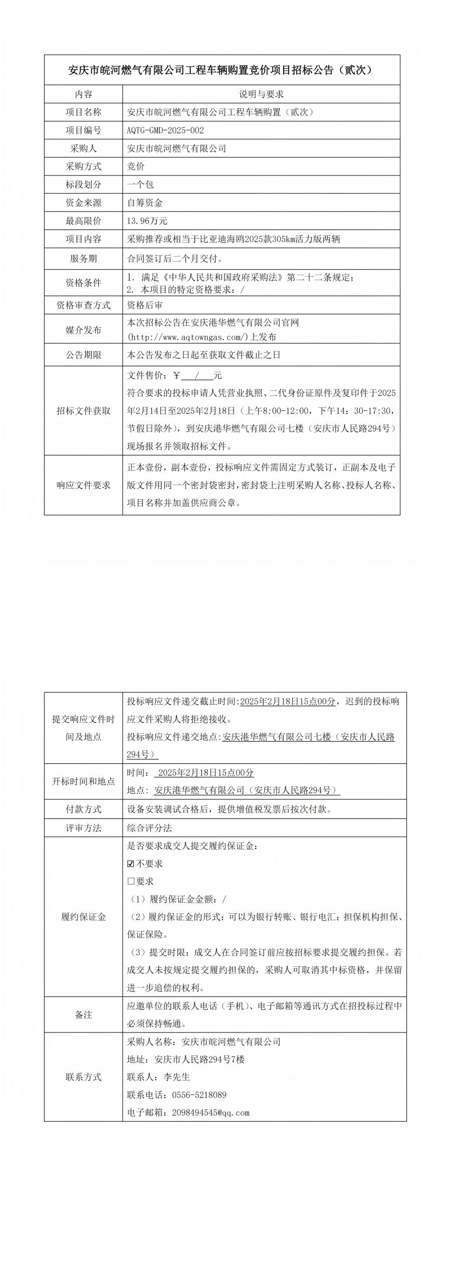 安慶市皖河燃氣有限公司工程車輛購置競價項目招標公告(貳次)