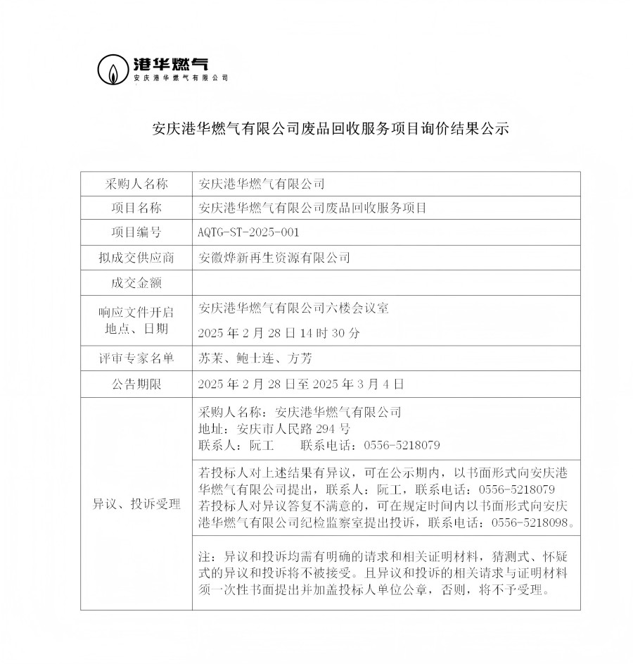 安慶港華燃?xì)庥邢薰緩U品回收服務(wù)項(xiàng)目詢(xún)價(jià)結(jié)果公示