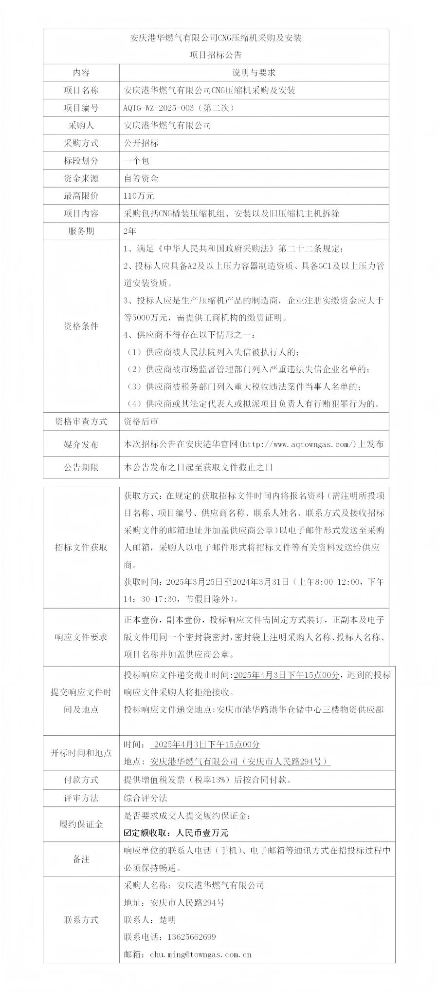 安慶港華燃氣有限公司CNG壓縮機采購及安裝項目招標公告