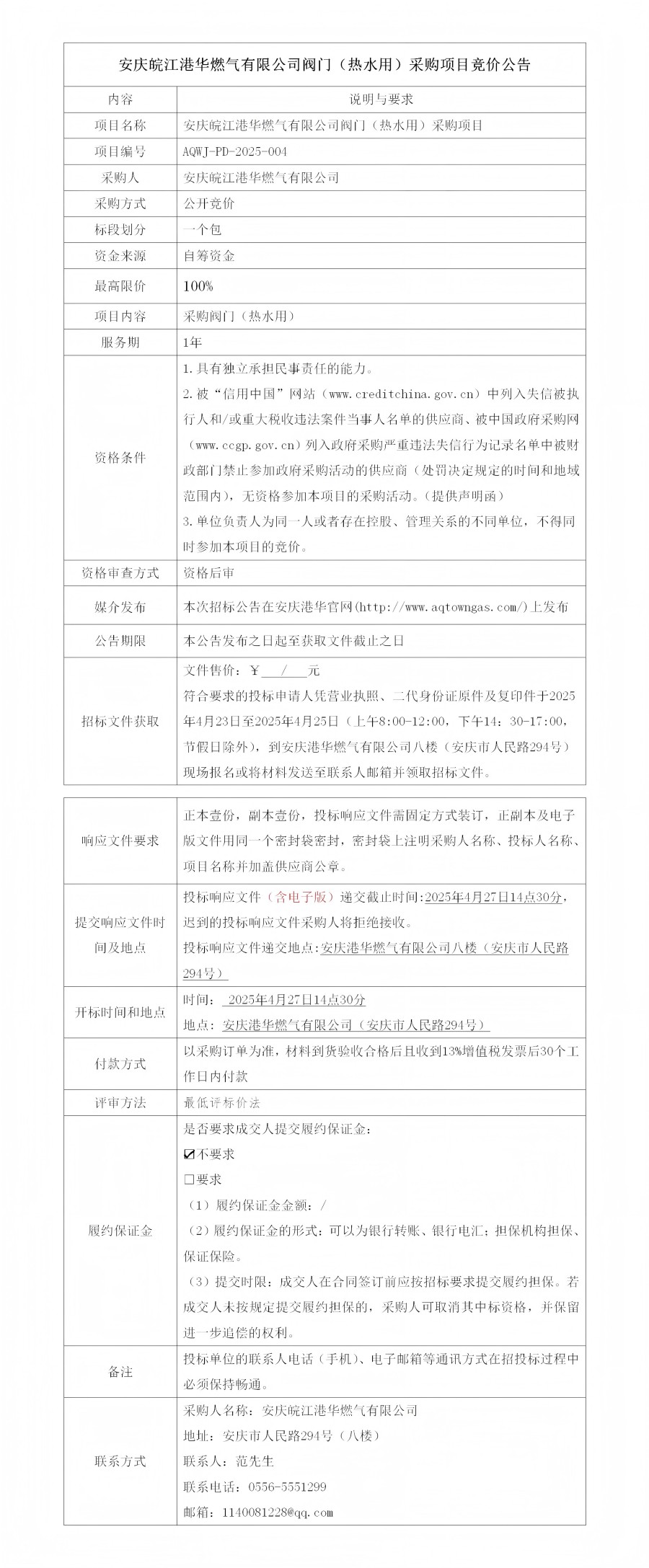 安慶皖江港華燃氣有限公司閥門(熱水用)采購項目競價公告