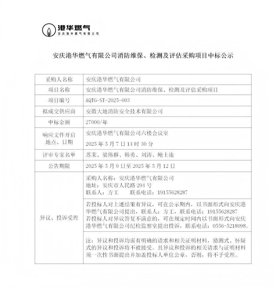 安慶港華燃?xì)庥邢薰鞠谰S保、檢測及評估采購項(xiàng)目中標(biāo)公示