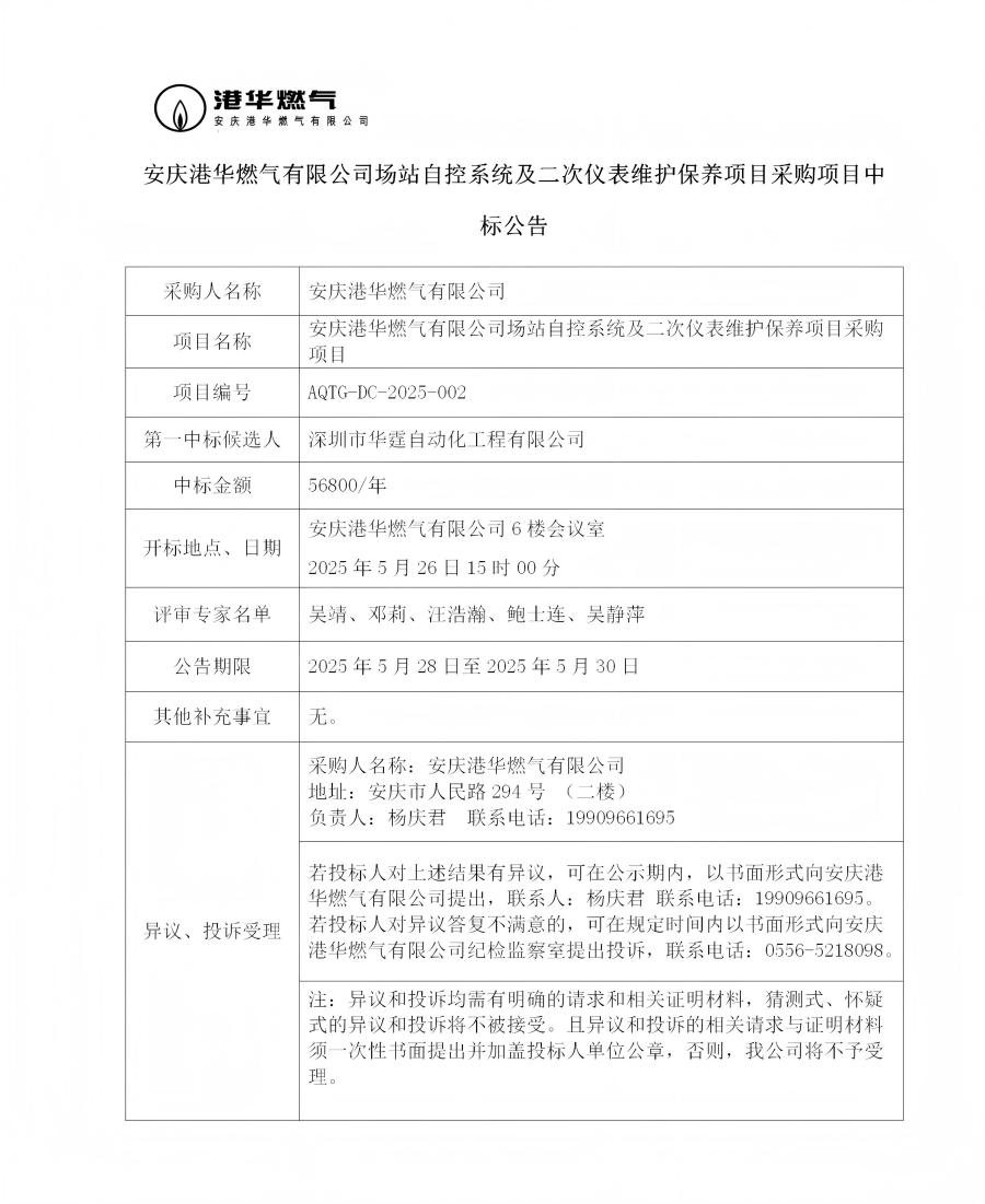 安慶港華燃氣有限公司場站自控系統(tǒng)及二次儀表維護保養(yǎng)項目采購項目中標公告
