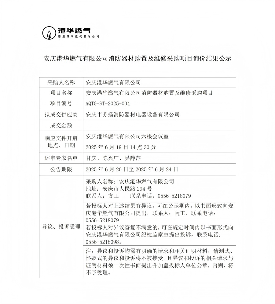 安慶港華燃?xì)庥邢薰鞠榔鞑馁?gòu)置及維修采購(gòu)項(xiàng)目詢價(jià)結(jié)果公示