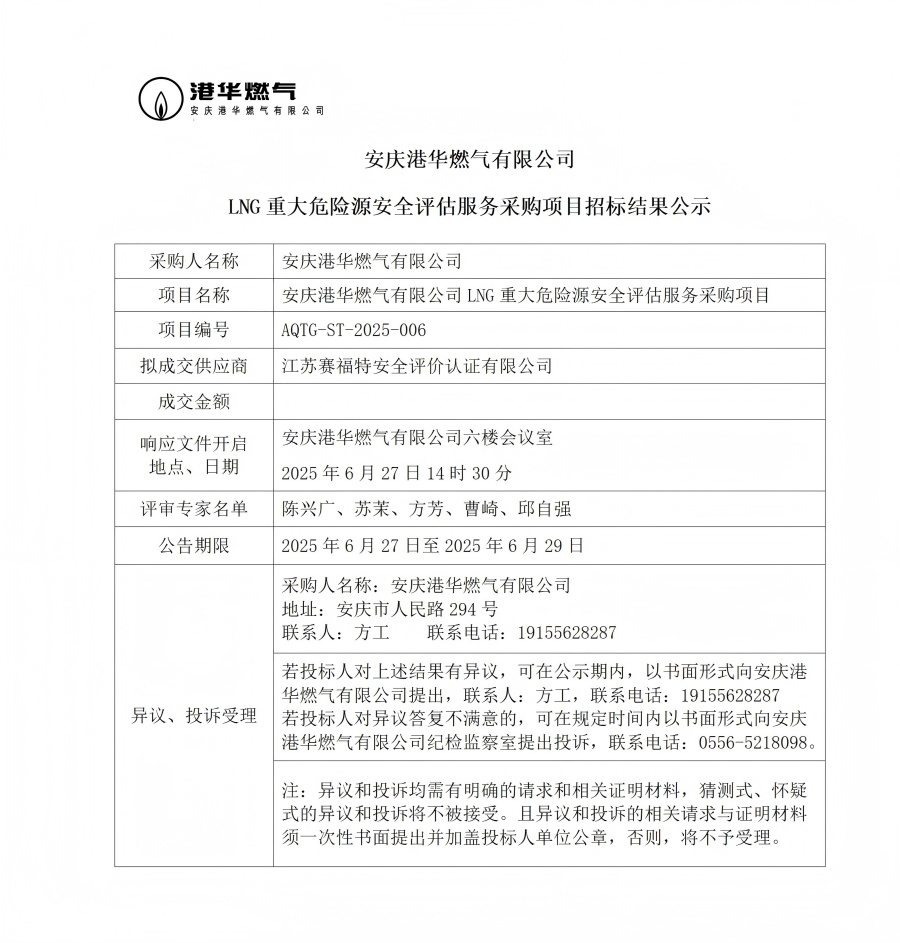安慶港華燃?xì)庥邢薰綥NG重大危險(xiǎn)源安全評(píng)估服務(wù)采購(gòu)項(xiàng)目招標(biāo)結(jié)果公示