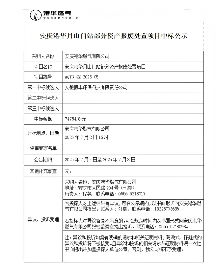 安慶港華月山門站部分資產(chǎn)報(bào)廢處置項(xiàng)目中標(biāo)公示
