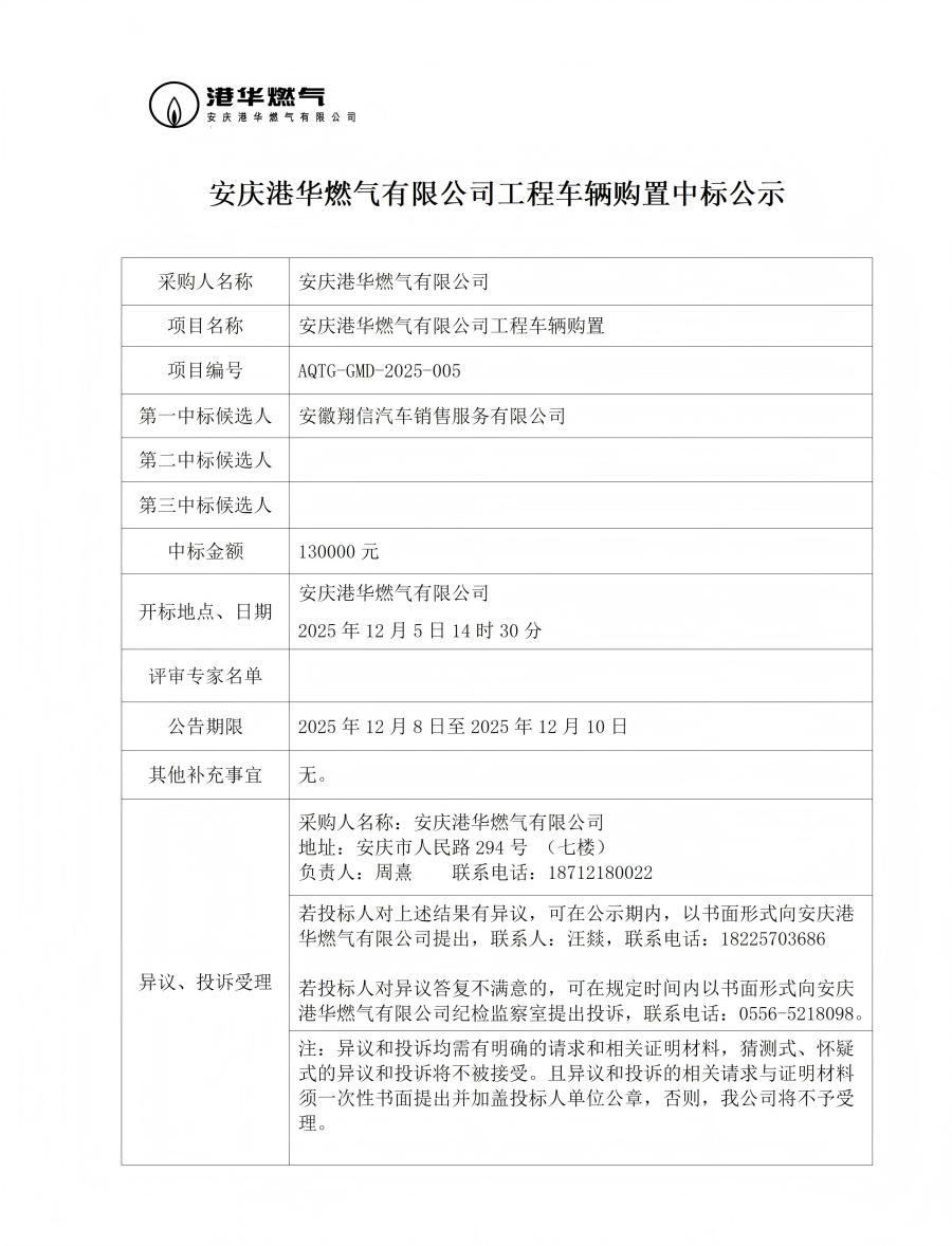 安慶港華燃?xì)庥邢薰竟こ誊囕v購置中標(biāo)公示 發(fā)布時(shí)間:2025-12-08    閱讀次數(shù):612次