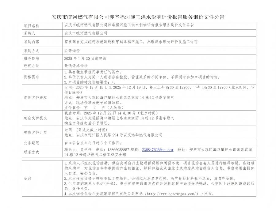 安慶市皖河燃?xì)庥邢薰旧嫘粮:邮┕ず樗绊懺u價報告服務(wù)詢價文件公告